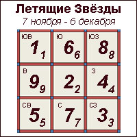 В каждом из 9-ти секторов 2 цифры . Большая цифра - это годовая летящая звезда, а маленькая цифра - летящая звезда месяца.